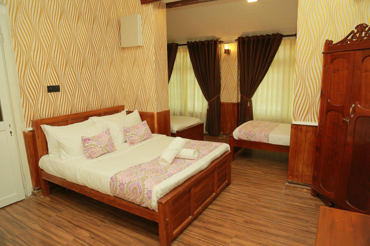 Deluxe Queen Room with Two Queen Beds. Providing free toiletries, this quadruple room includes a private bathroom with a bath, a shower and a bidet. This quadruple room consists of a dining area, a flat-screen TV with cable channels a tea and coffee maker and an outdoor dining area. The unit offers 2 beds. ;